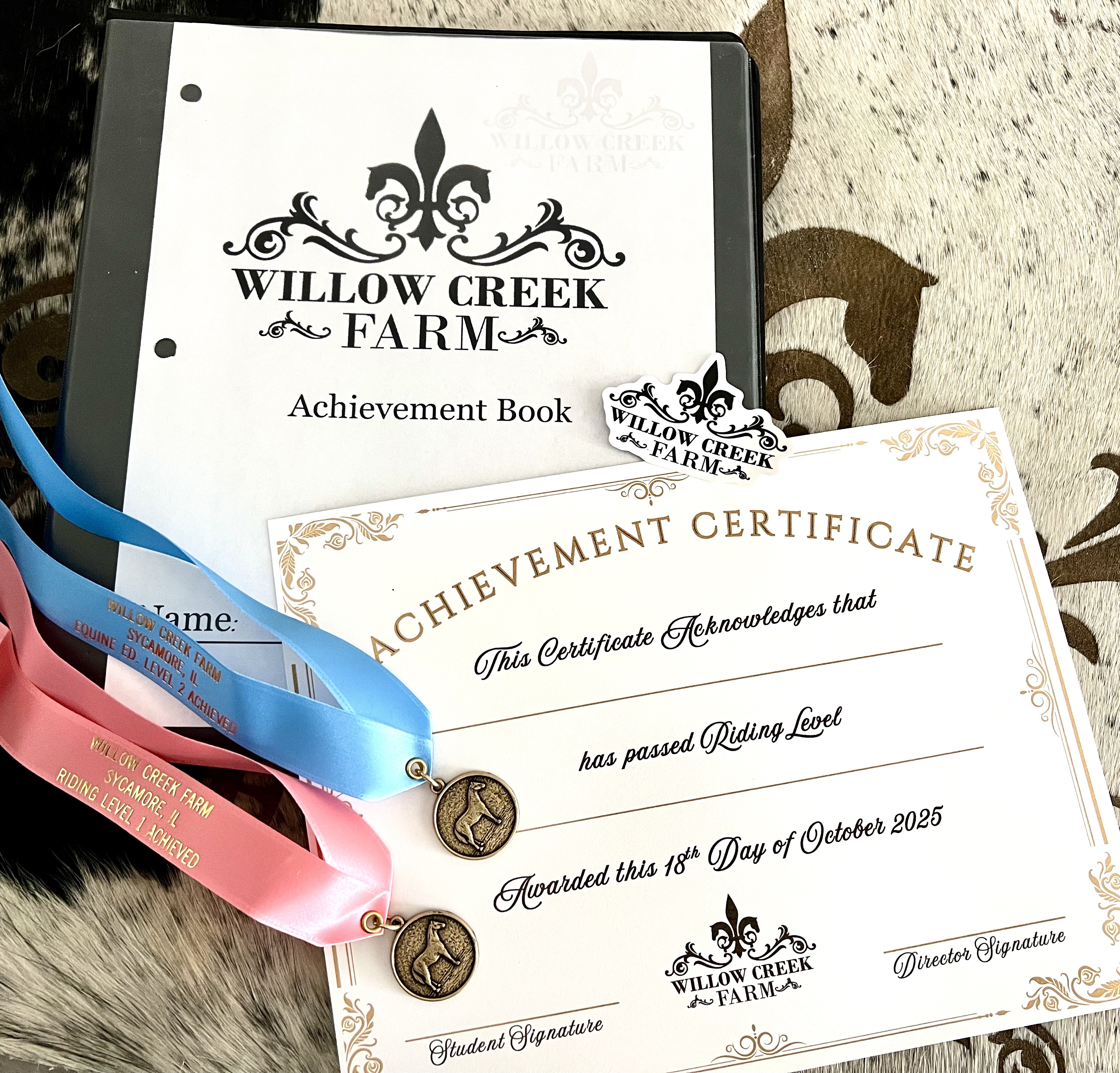 - Our one of a kind "Achievement Book" (over 100+ pages of material written by a certified teacher, and 30 year equine veteran)